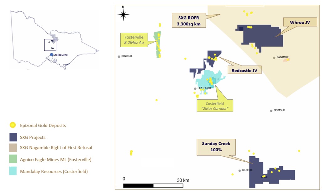 Figure 1: Location of the Sunday Creek project, along with SXG’s other Victoria projects.