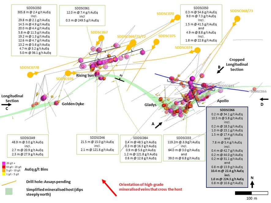Figure 3: Sunday Creek cropped longitudinal section A-B (50 m influence) across the Apollo area looking towards the northwest showing dyke interpreted mineralized veins sets, SDDSC066 reported here and prior reported drill holes.