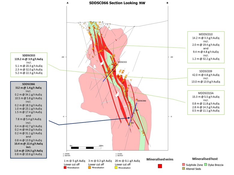 Specifically, SDDSC066 was drilled east to west sub-parallel to the host sequence, a zone of intensely altered ‘bleached’ sericite-albitic siltstones, and sericite-carbonate-albite altered dyke rocks that range from 50 m to 200 m wide. The hole was also drilled at a moderate to high angle to the north-west striking mineralized vein sets that regularly cross the host structure on a predominate north-west orientation and are typically 10 m to 40 m wide (cut off dependent), 20 m to 60 m along strike, and 300 m to 830 m down dip. Therefore, the hole was able to intersect five main mineralized structures over a 312 m wide downhole interval, while drilling inside the mineralized host.