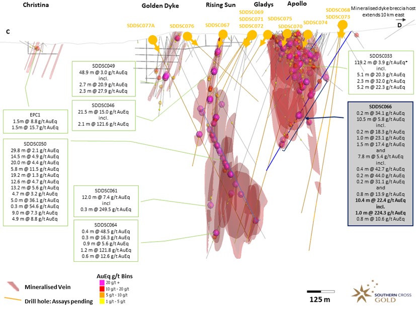 Noora Ahola, Mawson Interim CEO, states: “Yet another great result from the team at Southern Cross Gold. Delivering 10.4 m @ 22.4 g/t AuEq from 542.2 m, SDDSC066 continues the discovery of high grade intercepts at depth as the third best hit at the project to date and a 250 m to 300 m depth extension of SDDSC033 that also intersected a wide mineralized footprint with high grade components (including 119.2 m @ 3.9 g/t AuEq) almost a year ago to the day.