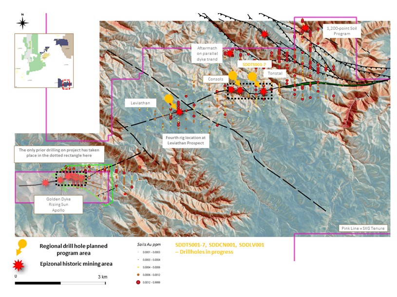 Drilling with four rigs is in progress at Sunday Creek and up to 7.5 km north-east at the Tonstal, Consols and Leviathan prospects. Sixteen new holes (SDDSC067, 69-75 and SDDTS001-7, SDDCN001 and SDDLV001) are currently being geologically processed and analyzed, with four holes (SDDSC068, 76, 77 and SDDLV001) in drill progress (Figure 2).