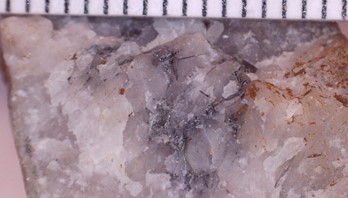 Photo 1: SDDSC066 262.5 m showing a fibrous Pb-Sb sulphosalt, possibly boulangerite (Pb5Sb4S11), commonly seen as alteration in epizonal systems.
