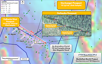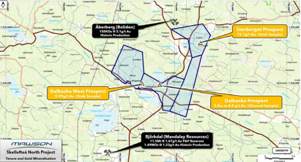Mandalay Resources Corporation operates the Björkdal gold mine located 8 km to the southwest of the Project, having historically produced over 1.3 Moz Au with a further 1 Moz Au remaining in M&I resources.